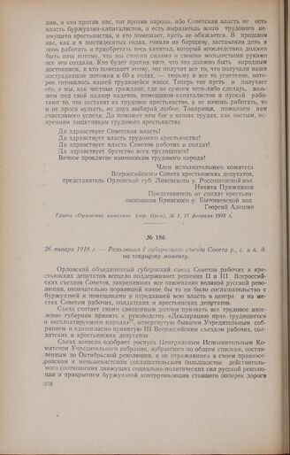 26 января 1918 г. - Резолюция I губернского съезда Совета р., с. и к. д. по текущему моменту // Газета «Орловские известия» (гор. Орел), № 1, 15 февраля 1918 г.