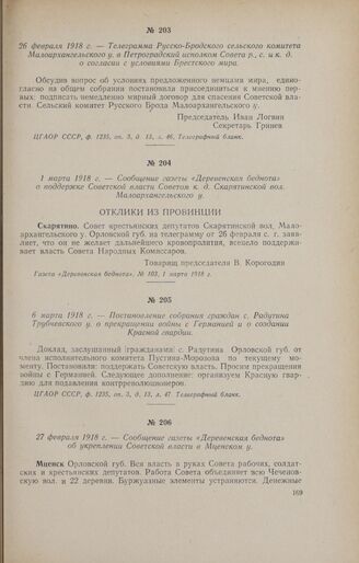 26 февраля 1918 г. - Телеграмма Русско-Бродского сельского комитета Малоархангельского у. в Петроградский исполком Совета р., с. и к. д. о согласии с условиями Брестского мира