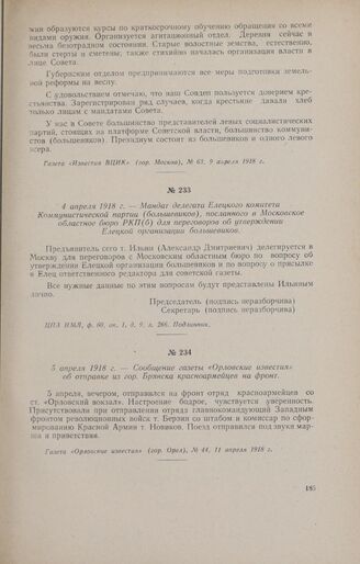 5 апреля 1918 г. - Сообщение газеты «Орловские известия» об отправке из гор. Брянска красноармейцев на фронт