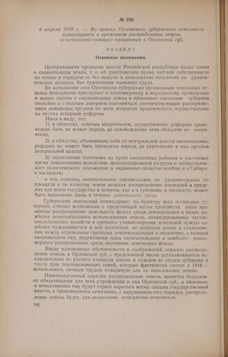 6 апреля 1918 г. - Из правил Орловского губернского земельного комиссариата о временном распределении земель сельскохозяйственного назначения в Орловской губ. // ГАОО, ф. Р-469, оп. 3, д. 1, л. 9. Типографский оттиск.