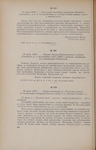 30 июня 1918 г. - Корреспонденция из «Советской газеты» об организации коммунистической ячейки в с. Тросном Елецкого у.