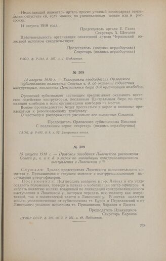 15 августа 1918 г. - Протокол заседания Ливенского уисполкома Совета р., к. и к. д. о мерах по ликвидации контрреволюционного выступления в Ливенском у.