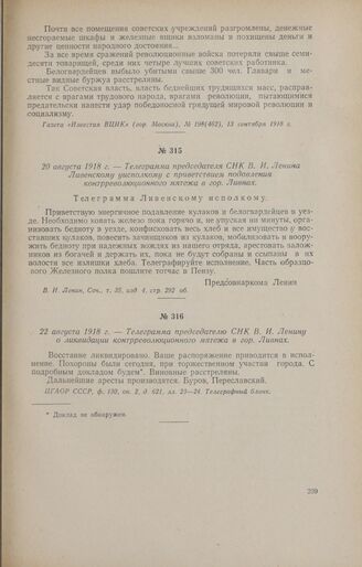 20 августа 1918 г. - Телеграмма председателя СНК В. И. Ленина Ливенскому уисполкому с приветствием подавления контрреволюционного мятежа в гор. Ливнах // В. И. Ленин, Соч., т. 35, изд. 4, стр. 292 об.