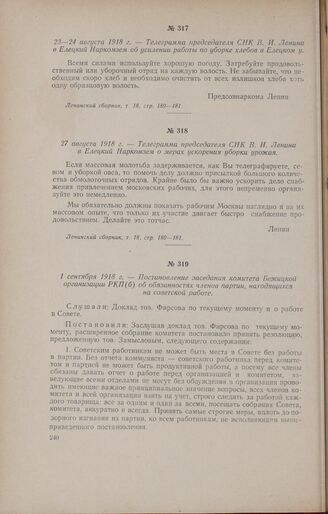 23-24 августа 1918 г. - Телеграмма председателя СНК В. И. Ленина в Елецкий Наркомзем об усилении работы по уборке хлебов в Елецком у. // Ленинский сборник, т. 18, стр. 180-181.