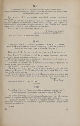 7 сентября 1918 г. - Письмо Председателя СНК В. И. Ленина народному комиссару земледелия Елецкого у. Середе об усилении работы по заготовке хлеба в волостях Елецкого у. // Ленинский сборник, т. 18, стр. 182-183.