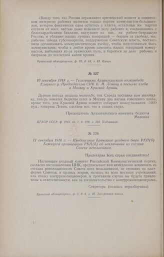 11 сентября 1918 г. - Предписание Брянского уездного бюро РКП(б) Бежицкой организации РКП(б) об исключении из состава Совета меньшевиков