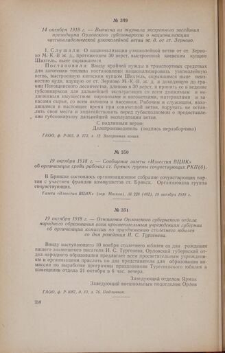 19 октября 1918 г. - Сообщение газеты «Известия ВЦИК» об организации среди рабочих ст. Брянск группы сочувствующих РКП(б) // Газета «Известия ВЦИК» (гор. Москва), № 228 (482), 19 октября 1918 г.