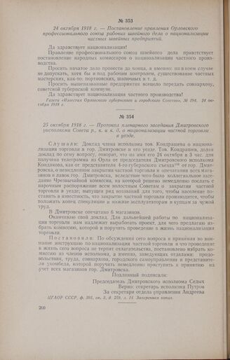 25 октября 1918 г. - Протокол пленарного заседания Дмитровского уисполкома Совета р., к. и к. д. о национализации частной торговли в уезде