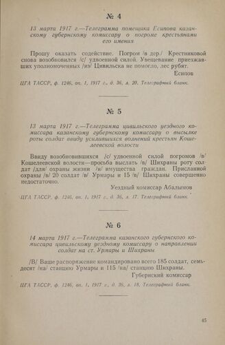 14 марта 1917 г. — Телеграмма казанского губернского комиссара цивильскому уездному комиссару о направлении солдат на ст. Урмары и Шихраны // ЦГА ТАССР, ф. 1246, оп. 1, 1917 г., д. 36, л. 18. Телеграфный бланк.