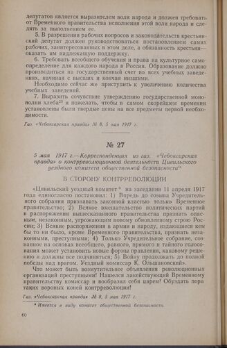 5 мая 1917 г. — Корреспонденция из газ. «Чебоксарская правда» о контрреволюционной деятельности Цивильского уездного комитета общественной безопасности