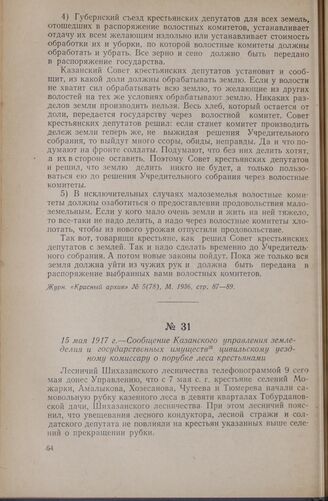 15 мая 1917 г. — Сообщение Казанского управления земледелия и государственных имуществ цивильскому уездному комиссару о порубке леса крестьянами // ЦГА ЧАССР, ф. 659, оп. 1, 1917 г., д. 4, л. 83. Подлинник.