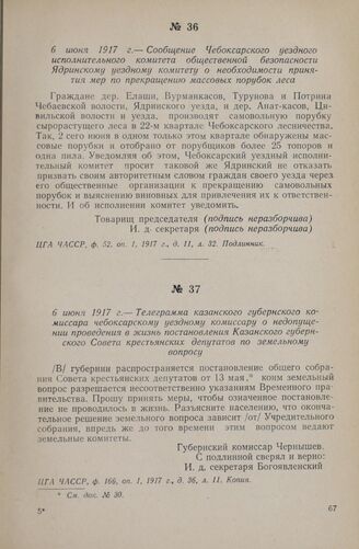 6 июня 1917 г. — Телеграмма казанского губернского комиссара чебоксарскому уездному комиссару о недопущении проведения в жизнь постановления Казанского губернского Совета крестьянских депутатов по земельному вопросу // ЦГА ЧАССР, ф. 166, оп. 1, 1917 г., д. 36, л. 11. Копия.
