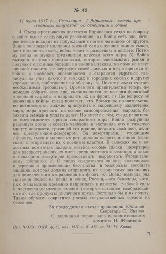 11 июня 1917 г. — Резолюция 1 Ядринского съезда крестьянских депутатов об отношении к войне // ЦГА ЧАССР, ОДФ, ф, 62, оп.1, 1917 г., д. 343, лл. 73—74. Копия.