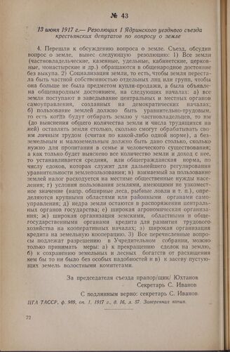 13 июня 1917 г. — Резолюция 1 Ядринского уездного съезда крестьянских депутатов по вопросу о земле // ЦГА ТАССР, ф. 989, оп. 1, 1917 г., д. 16, л. 57. Заверенная копия.