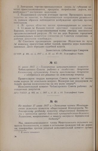 16 июня 1917 г. — Телеграмма исполнительного комитета Чебоксарского Совета рабочих и солдатских депутатов Казанскому губернскому Совету крестьянских депутатов с одобрением его решения по земельному вопросу