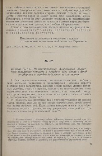 25 июня 1917 г. — Из постановления Аликовского волостного земельного комитета о передаче всей земли в фонд государства и порядке наделения ее крестьянам // ЦГА ЧАССР, ОДФ, ф. 62, оп. 1, 1917 г., д. 331, л. 1—2. Копия.