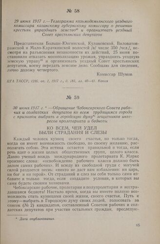 29 июня 1917 г. — Телеграмма Козьмодемьянского уездного комиссара казанскому губернскому комиссару о решении крестьян упразднить земство и организовать уездный Совет крестьянских депутатов // ЦГА ТАССР, 1246, оп. 1, 1917 г., д. 181, лл. 40—41. Копия.