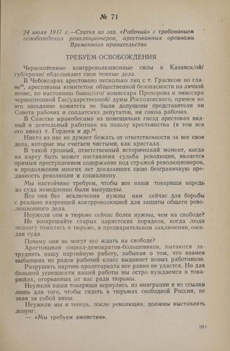 24 июля 1917 г. — Статья из газ. «Рабочий» с требованием освобожден...