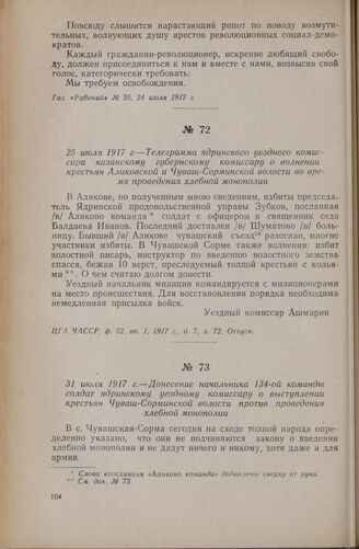 31 июля 1917 г. — Донесение начальника 134-ой команды солдат ядринскому уездному комиссару о выступлении крестьян Чуваш-Сорминской волости против проведения хлебной монополии