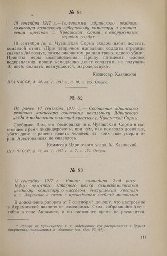13 сентября 1917 г. — Рапорт командира 2-ой роты 164-го пехотного запасного полка Козьмодемьянскому уездному комиссару о массовом выступлении крестьян в с. Акрамове в связи с проведением хлебной монополии