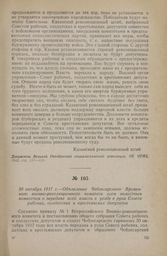 30 октября 1917 г. — Объявление Чебоксарского Временного военно-революционного комитета всем волостным комитетам о передаче всей власти в уезде в руки Совета рабочих, солдатских и крестьянских депутатов