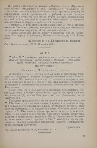 Ноябрь 1917 г. — Корреспонденция из газ. «Знамя революции» об осуждении крестьянами с. Полянки Ядринского уезда политики социалистов-революционеров