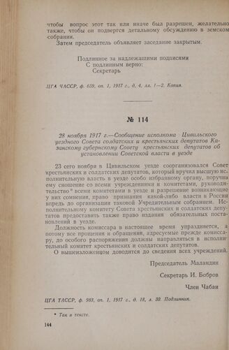 28 ноября 1917 г. — Сообщение исполкома Цивильского уездного Совета солдатских и крестьянских депутатов Казанскому губернскому Совету крестьянских депутатов об установлении Советской власти в уезде // ЦГА ТАССР, ф. 983, оп. 1, 1917 г., д. 18, л. 30. Подлинник.
