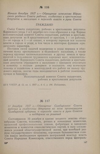 11 декабря 1917 г. — Обращение Симбирского Совета рабочих и солдатских депутатов ко всем организациям Симбирской губернии о переходе власти в руки Советов и поддержке их решений