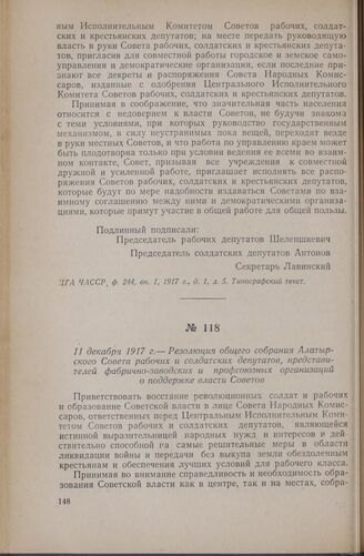 11 декабря 1917 г. — Резолюция общего собрания Алатырского Совета рабочих и солдатских депутатов, представителей фабрично-заводских и профсоюзных организаций о поддержке власти Советов // ЦГАОР, ф. 393, оп. 5, 1917 г., д. 62, л. 13. Копия.