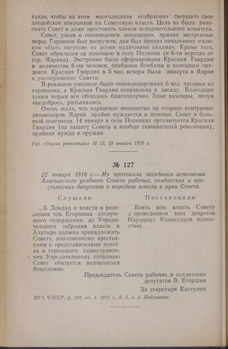 22 января 1918 г. — Из протокола заседания исполкома Алатырского уездного Совета рабочих, солдатских и крестьянских депутатов о передаче власти в руки Совета // ЦГА ЧАССР, ф. 244, оп. 1, 1918 г., д. 4, л. 4. Подлинник.