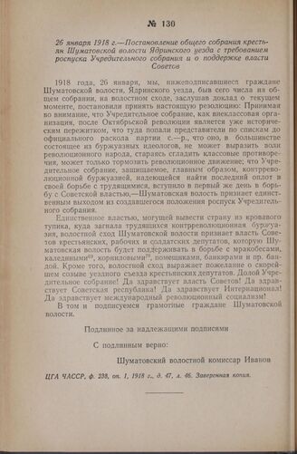 26 января 1918 г. — Постановление общего собрания крестьян Шуматовской волости Ядринского уезда с требованием роспуска Учредительного собрания и о поддержке власти Советов