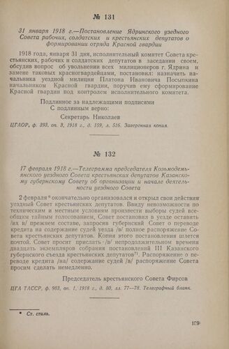 31 января 1918 г. — Постановление Ядринского узедного Совета рабочих, солдатских и крестьянских депутатов о формировании отряда Красной гвардии // ЦГАОР, ф. 393, оп. 3, 1918 г., д. 159, л. 516. Заверенная копия.