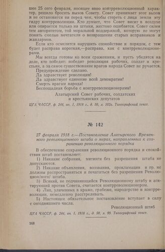 27 февраля 1918 г. — Постановление Алатырского Временного революционного штаба о мерах, направленных к сохранению революционного порядка // ЦГА ЧАССР, ф. 244, оп. 1, 1918 г., д. 50, л. 99. Типографский текст.