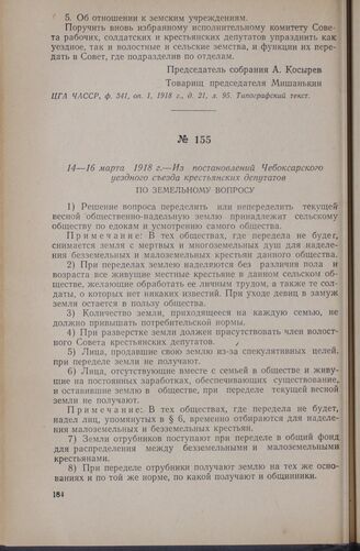 14—16 марта 1918 г. — Из постановлений Чебоксарского уездного съезда крестьянских депутатов // ЦГА ЧАССР, ф. 164, оп. 2, 1918 г., д. 22, лл. 33—36. Типографский текст;