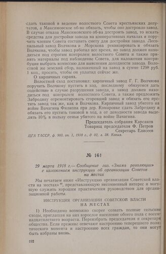 29 марта 1918 г. — Сообщение газ. «Знамя революции» с изложением инструкции об организации Советов на местах