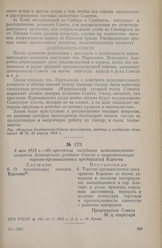 9 мая 1918 г. — Из протокола заседания исполнительного комитета Алатырского уездного Совета о национализации торгово-промышленных предприятий Карпова