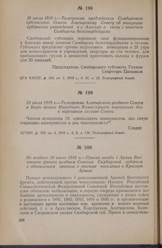 Не позднее 30 июля 1918 г. — Приказ штаба 1 Армии Восточного фронта уездным Советам Симбирской губернии с объявлением приказа о призыве населения в Красную Армию // ЦГА ЧАССР, ф. 335, оп. 1, 1918 г., д. 55, л. 4. Заверенная копия.