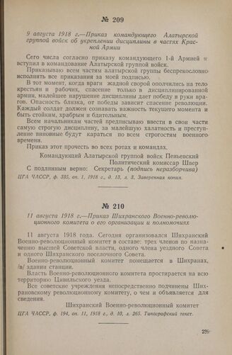 11 августа 1918 г. — Приказ Шихранского Военно-революционного комитета о его организации и полномочиях