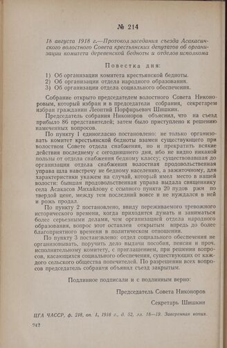 18 августа 1918 г. — Протокол заседания съезда Асакасинского волостного Совета крестьянских депутатов об организации комитета деревенской бедноты и отделов исполкома