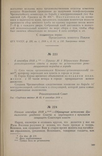 Начало сентября 1918 г. — Обращение исполкома Цивильского узедного Совета к трудящимся с призывом защищать Советскую власть