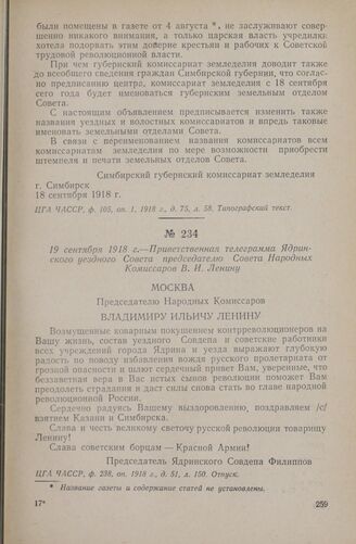 19 сентября 1918 г. — Приветственная телеграмма Ядринского уездного Совета председателю Совета Народных Комиссаров В. И. Ленину // ЦГА ЧАССР, ф. 238, оп. 1918 г., д. 51, л. 150. Отпуск.