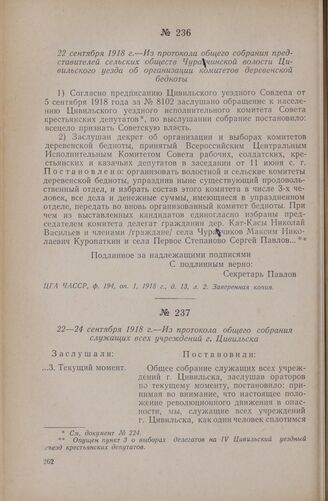 22 сентября 1918 г. — Из протокола общего собрания представителей сельских обществ Чурачинской волости Цивильского уезда об организации комитетов деревенской бедноты // ЦГА ЧАССР, ф. 194, оп. 1, 1918 г., д. 13, л. 2. Заверенная копия.