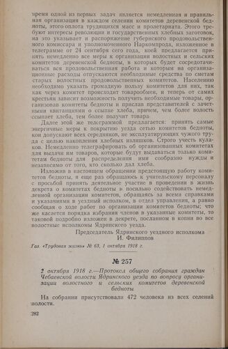 2 октября 1918 г. — Протокол общего собрания граждан Чебаевской волости Ядринского уезда по вопросу организации волостного и сельских комитетов деревенской бедноты // ЦГА ЧАССР, ф. 150, оп. 2, 1918 г., д. 33, л. 24. Копия.