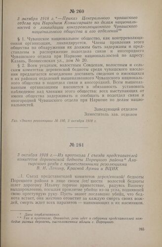 3 октября 1918 г. — Приказ Центрального чувашского отдела при Народном Комиссариате по делам национальностей о ликвидации контрреволюционного Чувашского национального общества и его отделений