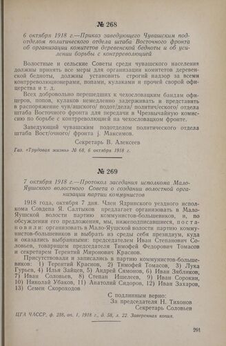 7 октября 1918 г. — Протокол заседания исполкома Мало-Яушского волостного Совета о создании волостной организации партии коммунистов // ЦГА ЧАССР, ф. 238, оп. 1, 1918 г., д. 58, л. 22. Заверенная копия.