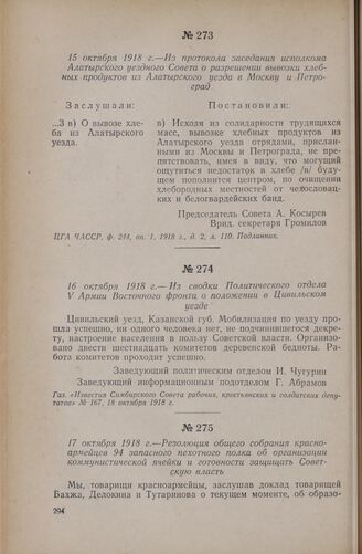 17 октября 1918 г. — Резолюция общего собрания красноармейцев 94 запасного пехотного полка об организации коммунистической ячейки и готовности защищать Советскую власть // ЦГА ЧАССР, ф. 243, оп. 1, 1918 г., д. 22, л. 15. Заверенная копия.