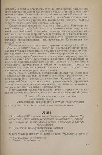 29 октября 1918 г. — Заявление бывшего председателя Чувашского левого социалистического комитета А. Краснова о выходе из партии левых эсеров и переходе в партию коммунистов
