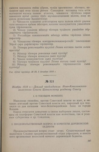 Ноябрь 1918 г. — Доклад председателя Ново-Ковалинского волостного Совета Цивильскому уездному Совету