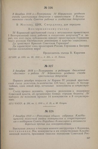 5 декабря 1918 г. — Телеграмма в редакцию бюллетеня «Вестник» о работе IV Ядринского уездного съезда крестьянских депутатов