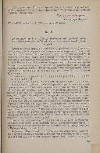 20 декабря 1918 г. — Приказ Чебоксарской уездной чрезвычайной комиссии о борьбе с контрреволюционной провокацией // ЦГА ЧАССР, ф. 7, оп. 1, 1918 г., д. 23, л. 108. Типографский текст.